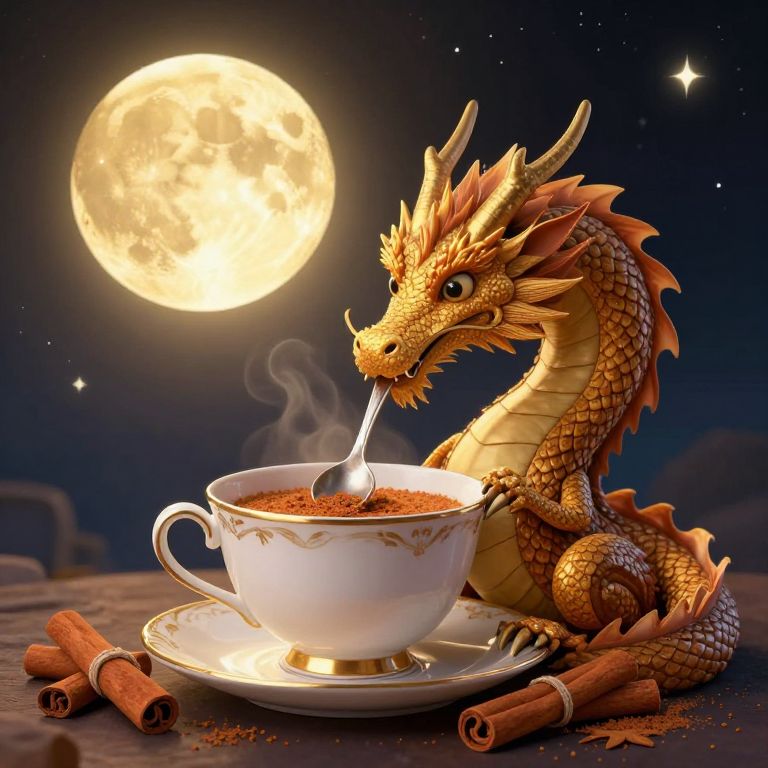 A whimsical digital illustration depicts a cinnamon-scented dragon curled around a teacup, sipping from a spoon as if enjoying solar radiation under the glow of a golden moon and starlit sky, blending fantasy with surreal realism in a high-definition, otherworldly scene.