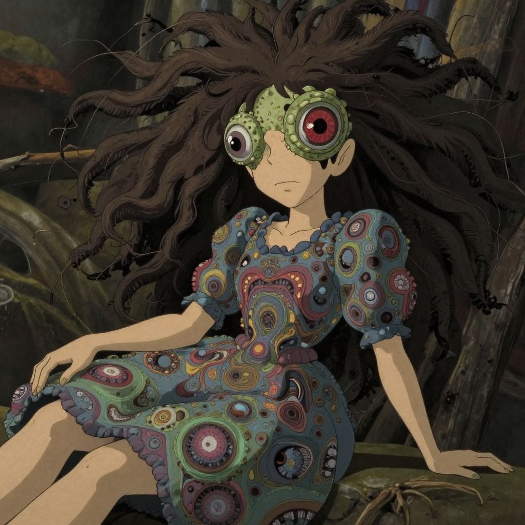 [by nemn|Studio Ghibli|Jenny Brasier|Ruth Bernhard]breaka beautiful monster girl, detailed reptile eyes, detailed crazy hair, detailed fractal dress designed by Sussanne Khan and Lou Dallas by Raffaella Hanley, relaxed pose, breakbest quality, high quality, masterpiece, emphasize high-resolution, realistic textures, and dynamic lighting to enhance visual depth and detail