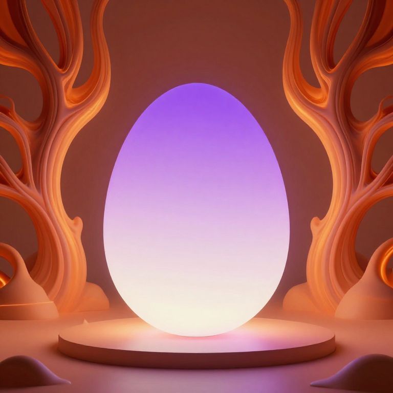 The image presents a surreal scene featuring a large, glowing egg with a gradient of purple to white light emanating from its surface. The egg is centrally positioned on a circular platform, casting a soft glow on the surrounding floor. Flanking the egg are two intricate, organic structures with a network of interwoven, flame-like patterns, bathed in a warm, orange hue. These structures appear to be floating or emerging from the ground, creating a sense of depth and dimension. The overall composition is balanced, with the egg serving as the focal point, while the organic structures add a sense of mystery and complexity to the scene. The lighting and textures create a dreamlike atmosphere, evoking a sense of otherworldliness and technological advancement.