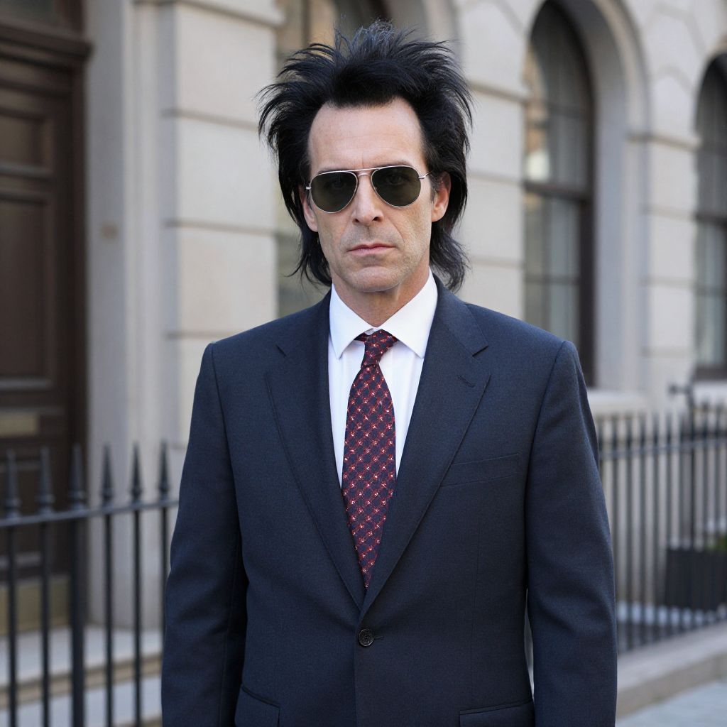 Photograph of a middle-aged white man with pale skin, black spiky hair, and brown aviator sunglasses. He is wearing a black suit, white dress shirt, and red patterned tie. He stands in front of a blurred, urban background featuring a stone building with arched windows and a black iron fence. The man's expression is neutral, and he is centered in the frame. The lighting is natural, and the overall style is contemporary, with a slight focus on the subject and a shallow depth of field.