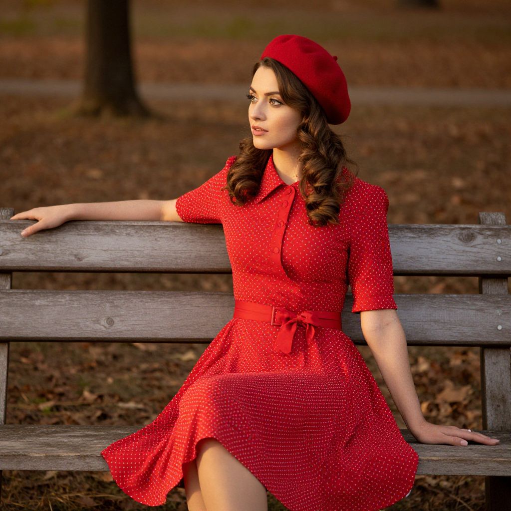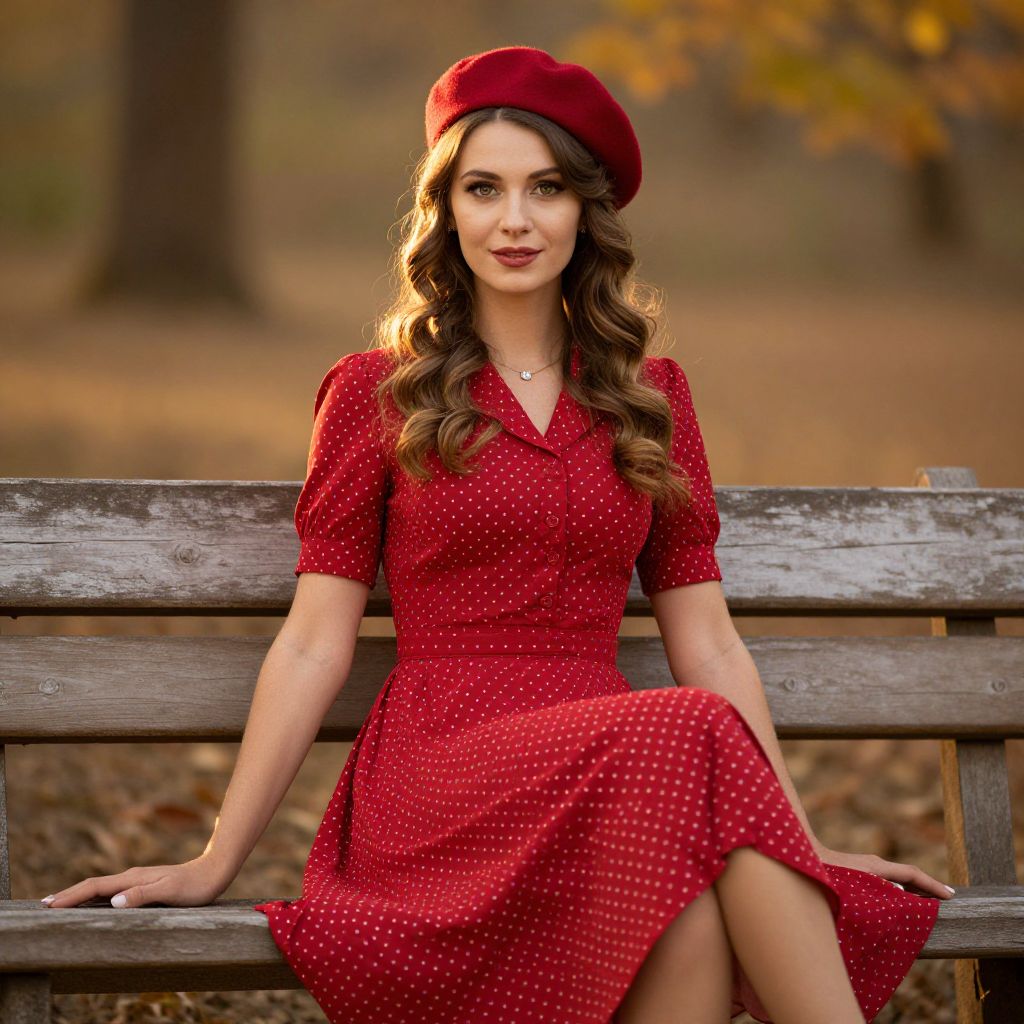 A woman in a vintage-inspired red dress and matching beret sits gracefully on a wooden bench amidst a serene autumnal setting, exuding a classic and relaxing ambiance with golden-hour lighting that enhances the warm, nostalgic atmosphere.