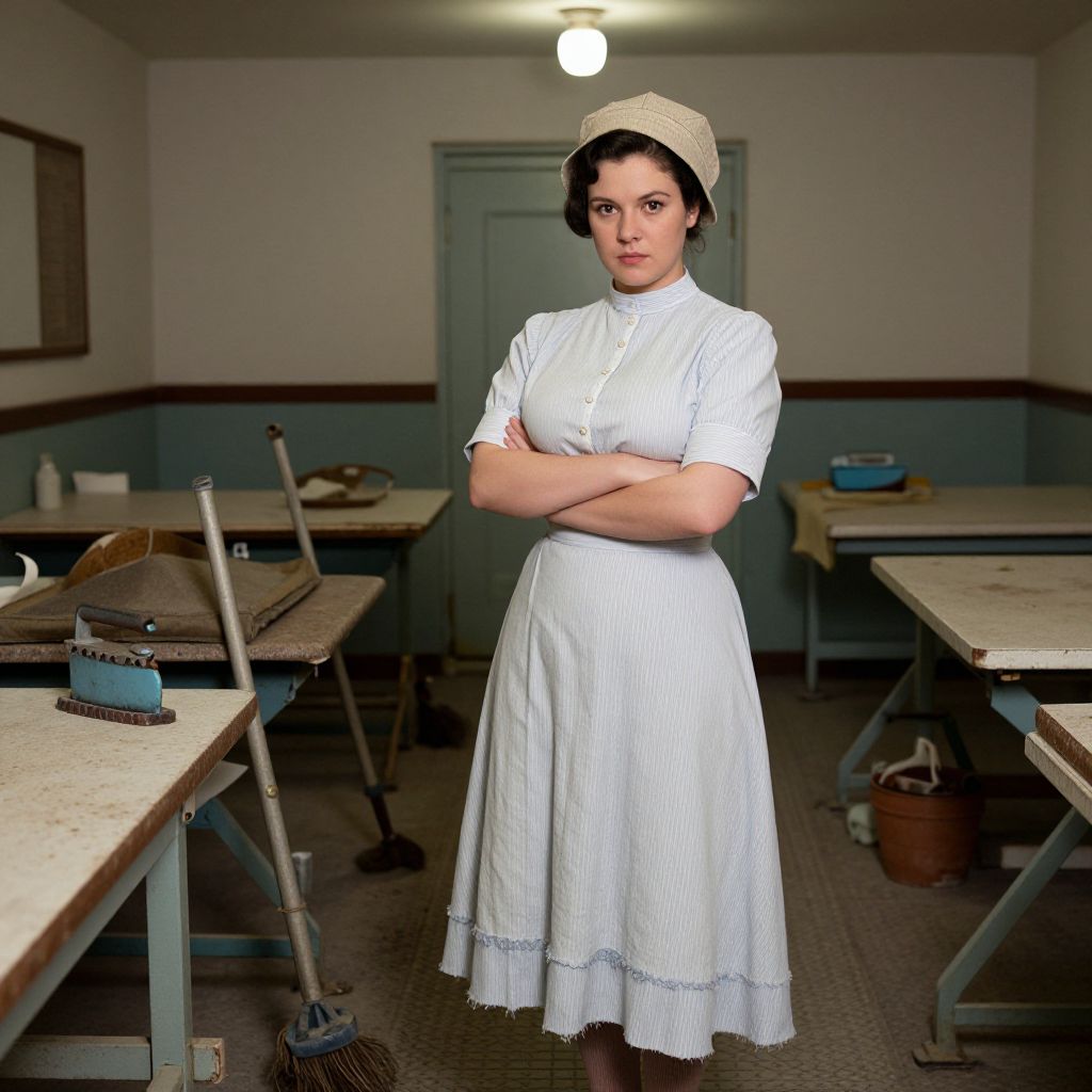 A well-lit, documentary-style photograph of a working-class woman in a 1930s laundress costume — rolled sleeves, high-necked dress with frayed hem, and a practical hat — sweeping a floor in a small, dusty laundromat filled with old spinners and ironing trays; she has a strong jawline, clear brown eyes, and a no-nonsense expression, standing with her arms crossed, the light coming from a single overhead bulb. The woman has big tits and cute face
