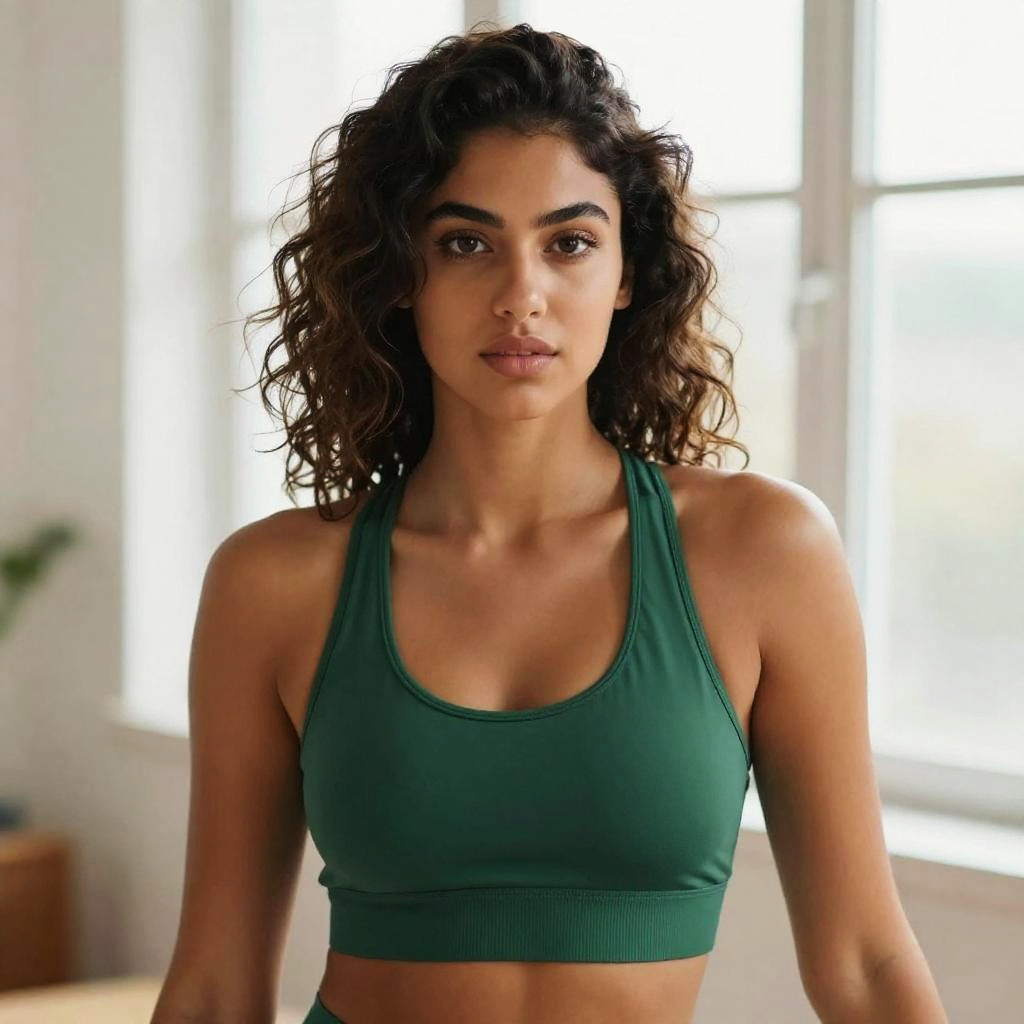 Photograph of a young woman with wavy, dark brown hair and medium tan skin, sitting indoors near a bright window. She's wearing a green, sleeveless sports bra, showing a fit and slim physique. Her expression is calm and slightly curious, with dark brown eyes and subtle makeup. The background is softly blurred, highlighting her as the main focus.