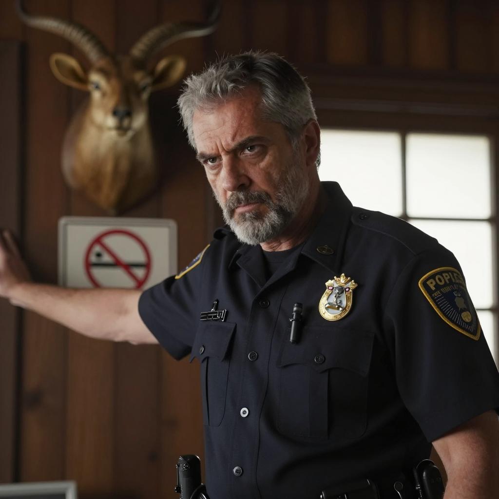 Photograph of three men in a wooden-paneled room. Elderly man in black naval uniform with gold stripes, serious expression, stands left. Middle-aged man in black police uniform, holding cigarette, serious expression, stands right. Younger man in black police uniform, neutral expression, stands behind. Painting of landscape on wall, white candles on table, lamp on right.