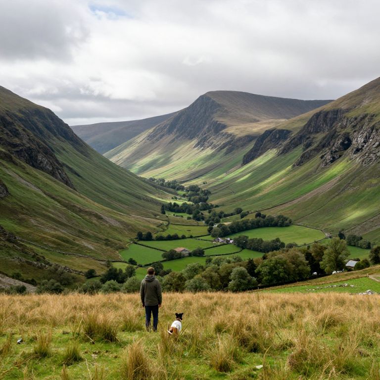Panoramic view of lush green valleys and towering mountains in the UK countryside, with a lone figure and a dog gazing over a golden meadow.