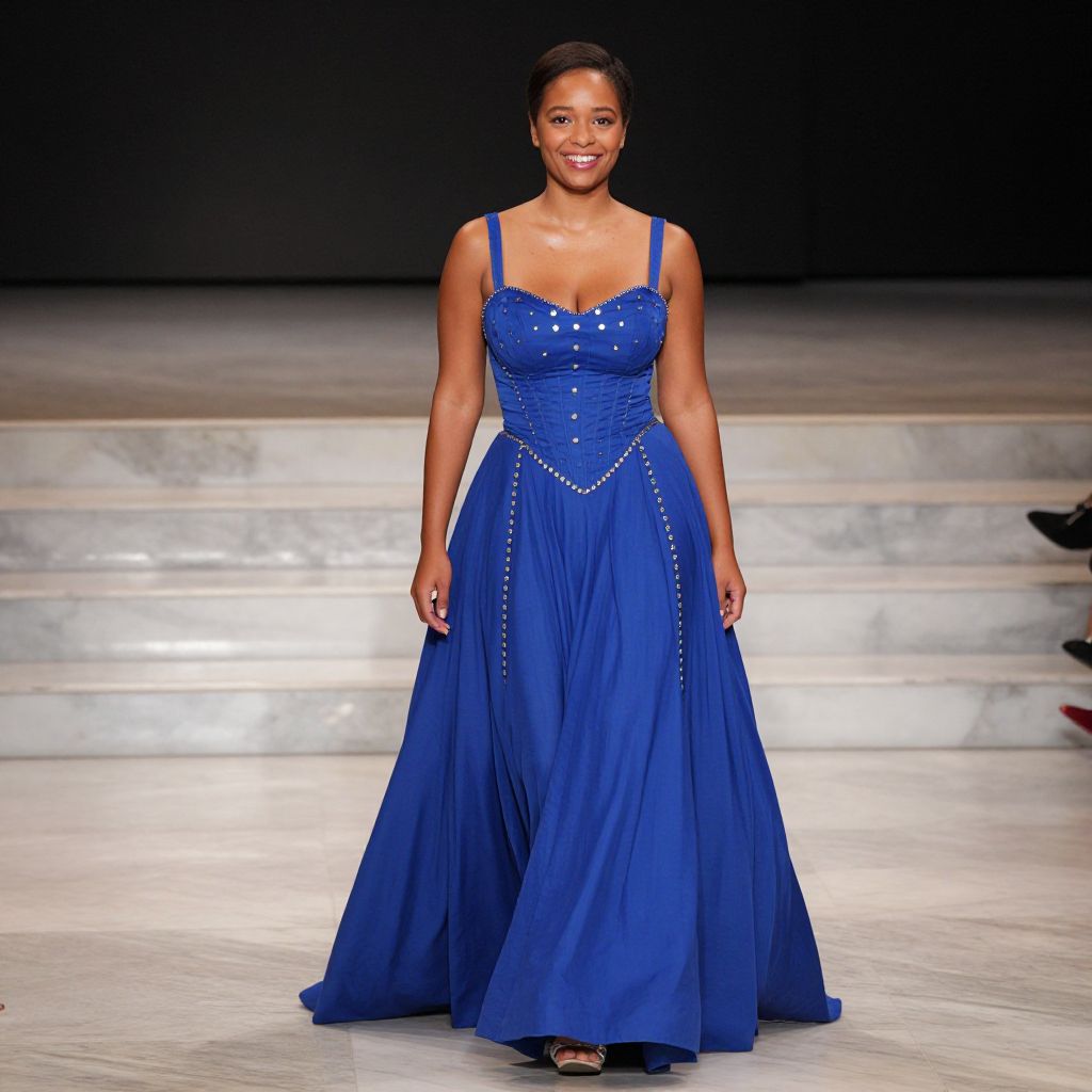 A modern fashion show scene where a woman with soft, warm brown skin and a bright smile stands in front of a polished marble stage, dressed in a royal blue long gown that blends haute couture with costume elements—embellished with silver buttons and a structured bodice designed for dramatic effect.. The woman has big tits and cute face