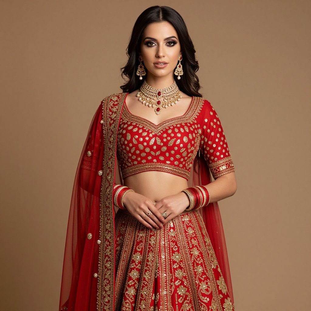 Photograph of a beautiful South Asian woman in a red, gold-embroidered traditional lehenga and dupatta, wearing intricate jewelry, against a