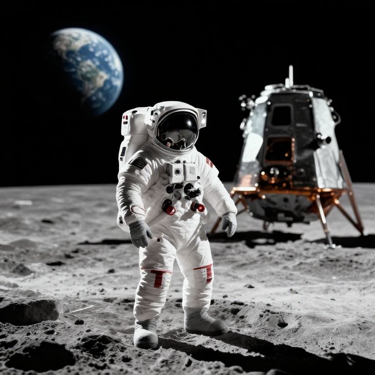 Photograph of an astronaut in a white spacesuit standing on the moon's surface, with a lunar module and Earth visible in the dark, starless