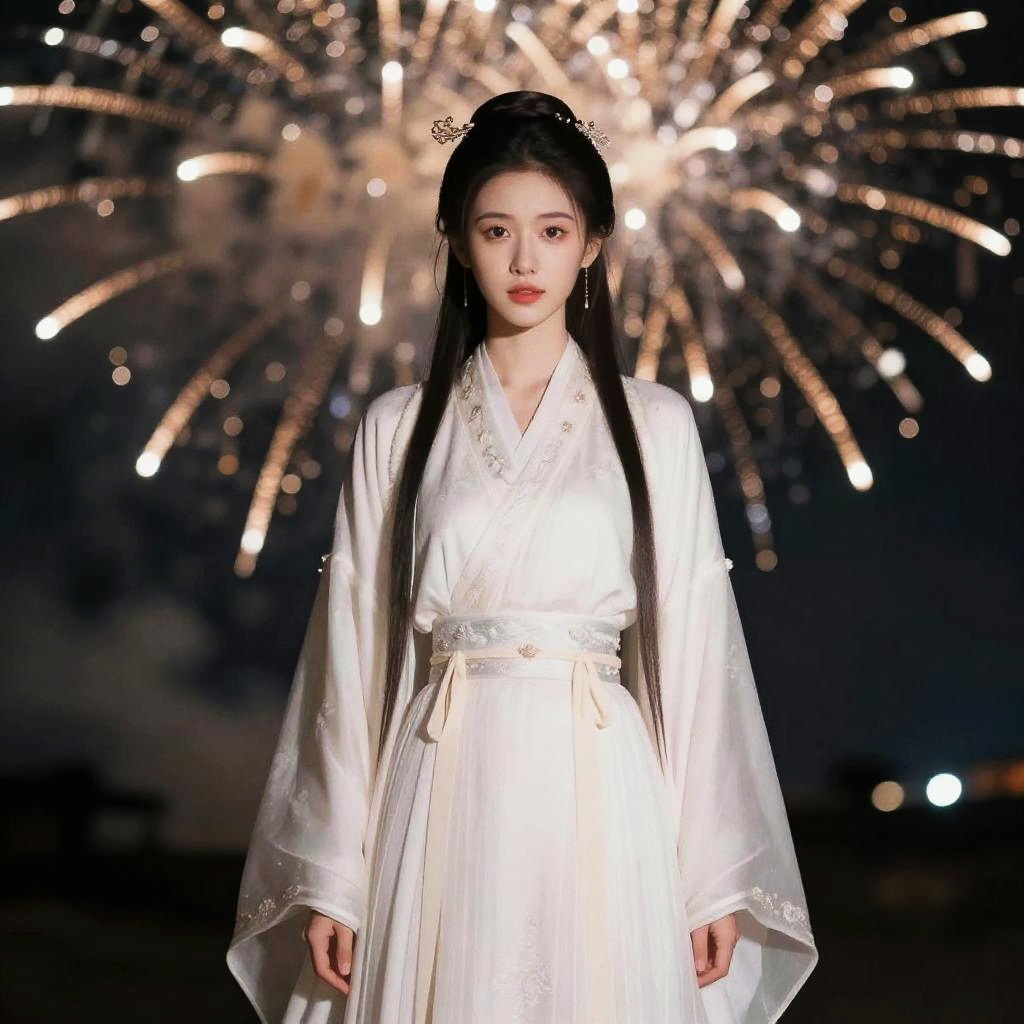 Masterpiece, (best quality:1.3), ultra high res, raw photo, detailed skin, beautiful lighting, (realistic, photo-realistic:1.4), 1girl, guofeng, full body, (Fireworks background:1.2)