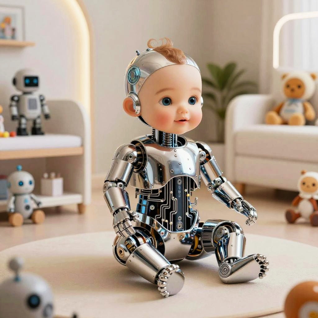 Babytron mechanical infant, detailed chrome and circuitry babytron, sitting in a high-tech nursery filled with robotic toys, soft diffused lighting, futuristic textures and reflective surfaces, concept art style with a warm yet high-tech atmosphere