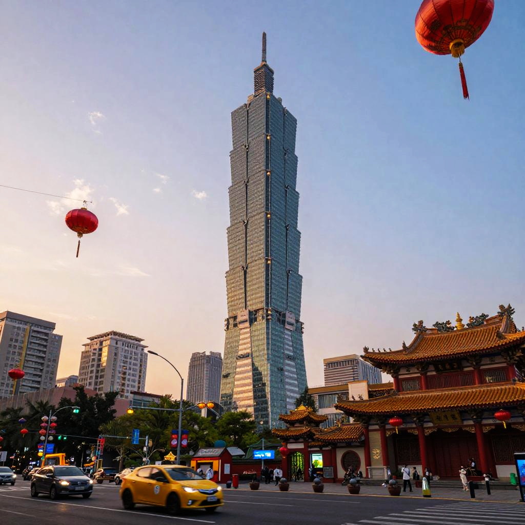 Taiwanese landmarks at sunset, vibrant Taipei 101 towering amidst bustling city streets, traditional temples nearby, colorful lanterns floating in the sky, hyper-realistic style