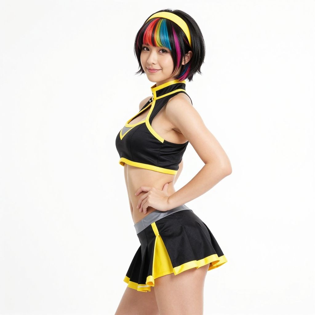 Photograph of an Asian woman with a short, black bob haircut featuring vibrant blue and pink streaks. She wears a black and yellow sports-style outfit with a sleeveless crop top and matching mini skirt, both trimmed in yellow. She also has a yellow headband. She stands in a three-quarter profile, smiling, with her right hand on her hip. The background is plain white, emphasizing her colorful hair and outfit. The image has a bright, high-contrast, and slightly glossy finish, highlighting her athletic and playful appearance.