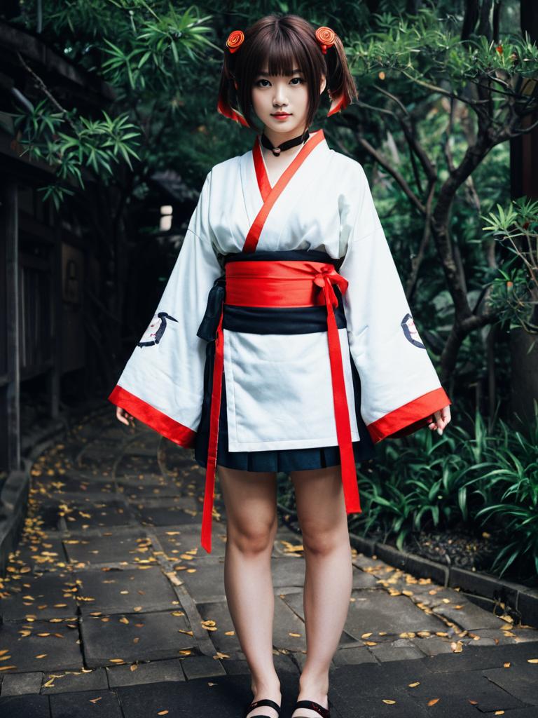 Photo-realistic cosplay photo of person in mumei (kabaneri) costume. Full body. Standing. Full length. 1girl, red eyes, brown eyes, short hair, brown hair, black hair, twintails, hair ribbon, medium breasts, short kimono, ribbon choker, long sleeves