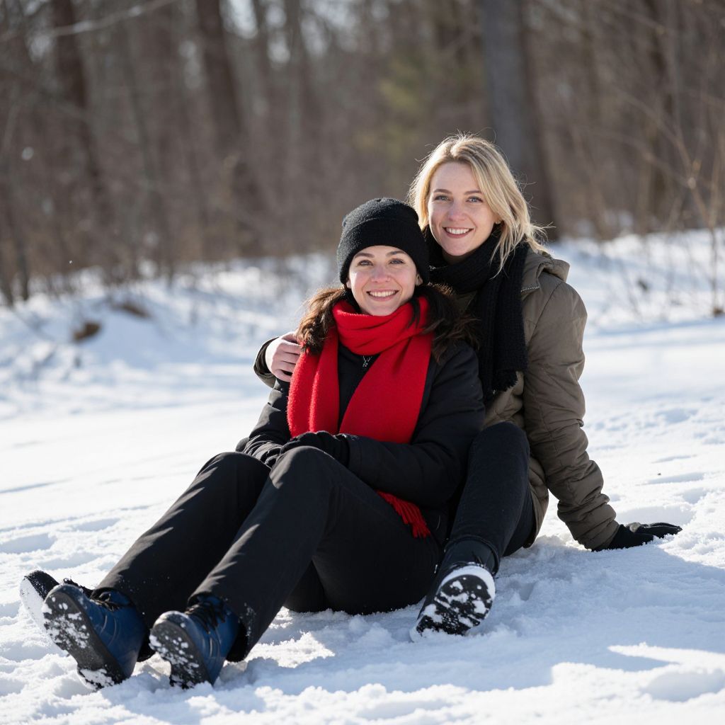 A photograph of two women sitting in the snow, with a blurred forest background. The woman in front has dark hair, a black beanie, and a red scarf, wearing black pants and blue shoes. The woman behind her has blonde hair, a brown jacket, and a black scarf, with her arm around the first woman. Both are smiling. Sunlight highlights the snow-covered ground.