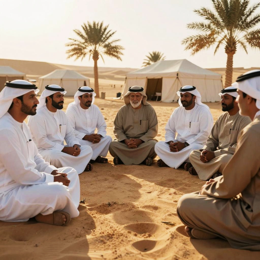 Quraysh tribal leaders gathered in a desert meeting, traditional Arabian robes and headgear, tents and palm trees in the background, sunset lighting casting long shadows, historic and cultural vibe, expressive facial features showing wisdom and unity