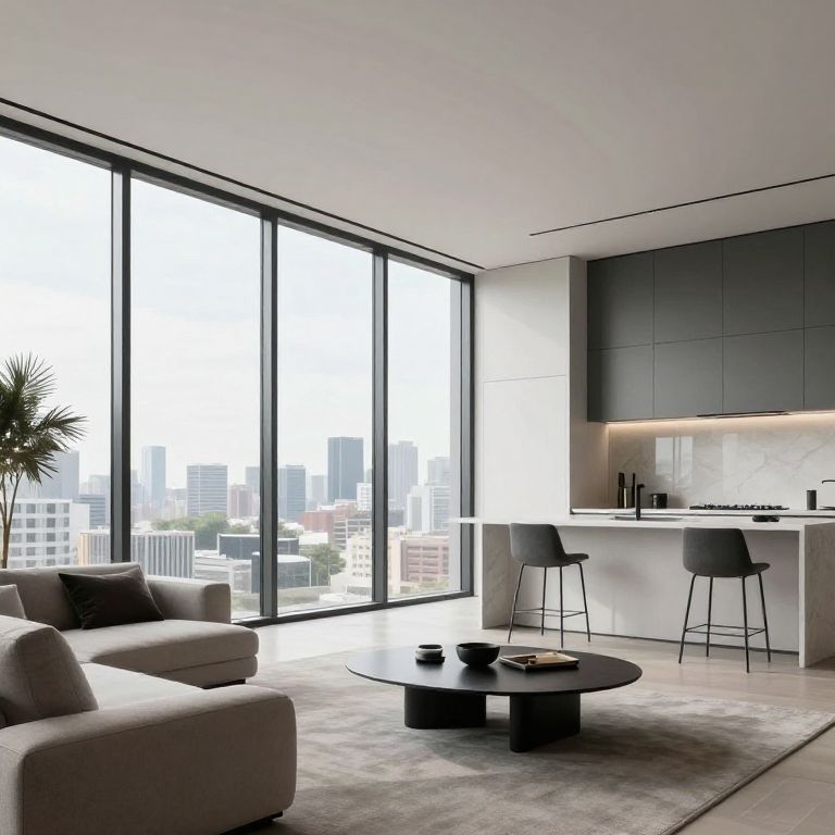 A modern design luxury apartment with floor-to-ceiling windows, minimalist furniture, and a minimalist open-plan living area with a sleek, contemporary kitchen and a panoramic city view.