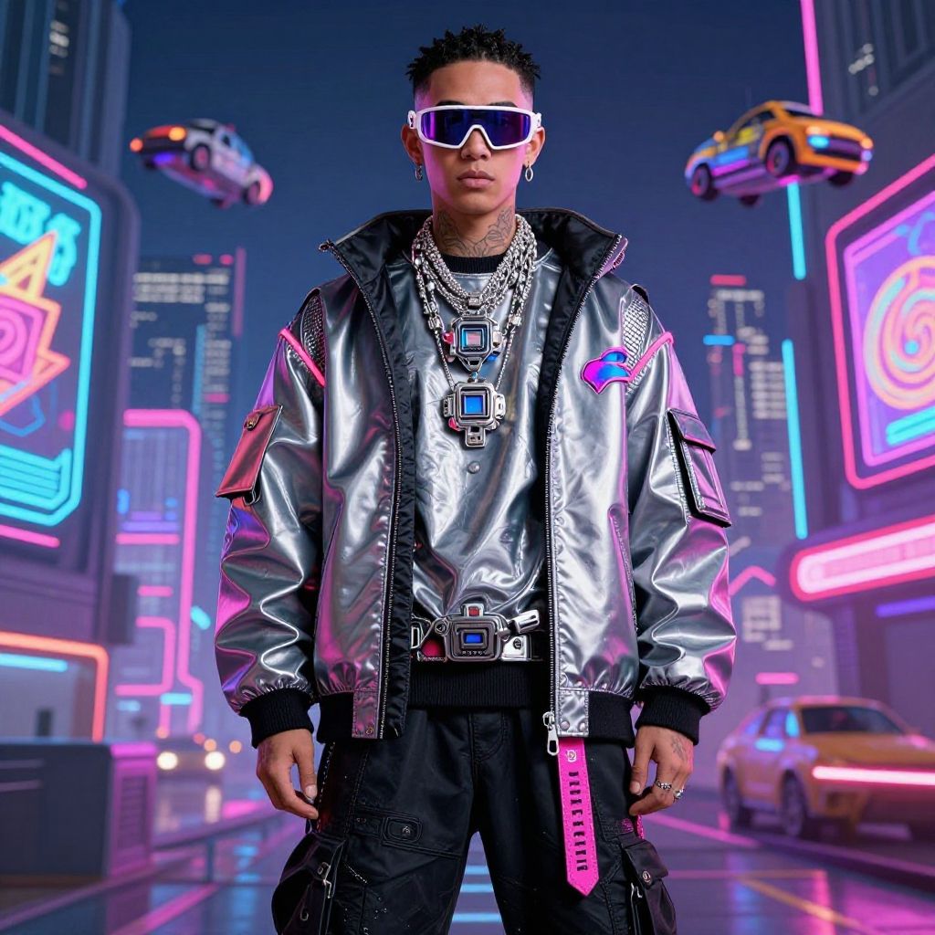 A digital illustration of a young Black man with short, spiky hair and dark skin, standing confidently in a neon-lit, futuristic cityscape. He wears white, reflective sunglasses, a shiny silver bomber jacket with pink and purple accents, a black t-shirt, and black pants. Multiple chains and pendants hang around his neck. His hands are relaxed by his sides. Background features glowing neon signs, flying taxis, and tall buildings. The scene has a vibrant, cyberpunk aesthetic with vivid colors and sharp contrasts.