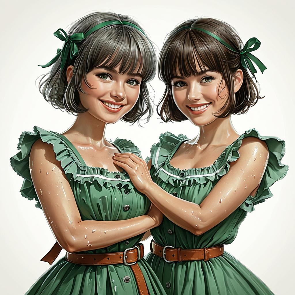 (masterpiece:1.2), best quality, illustration, beautiful detailed girl, (1girl) (passing:1.2) with another preson, front view, (arms aside:1.1), (sweat:1.2), (smile:1.1), open mouth, upper body, grey eyes, (short hair:1.0), blunt bangs, green frilled dress, botton, ribbon, belt