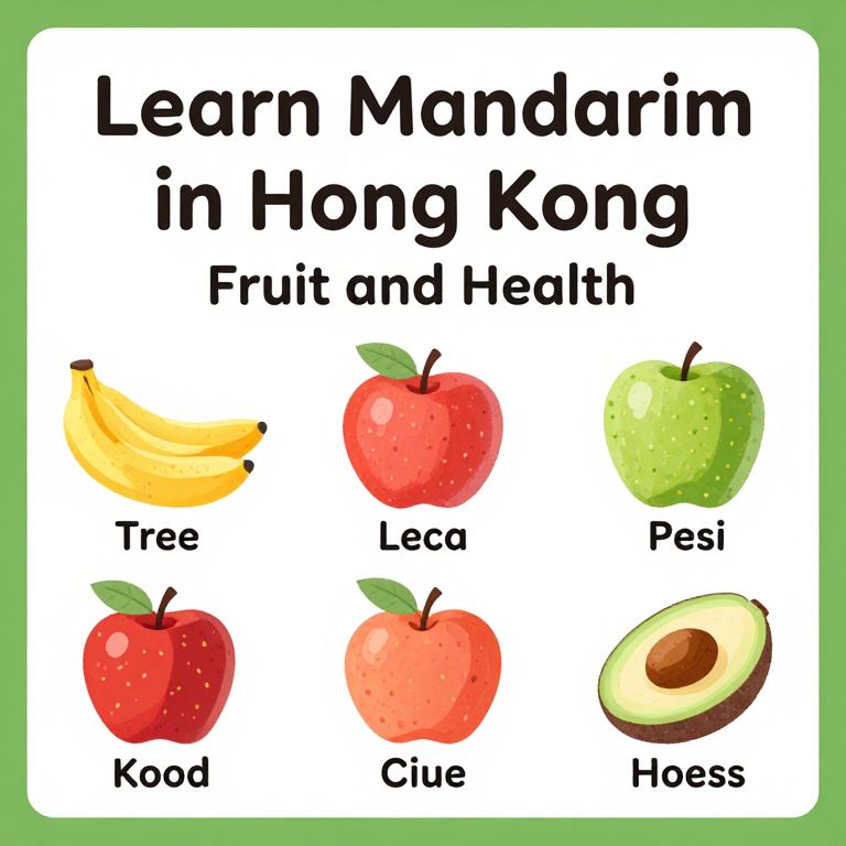 Colorful educational illustration: "Learn Mandarin in Hong Kong, Fruit and Health" with images of banana, red apple, green apple, red apple,