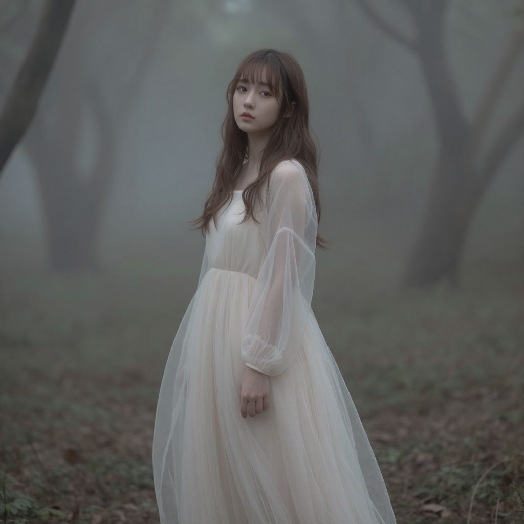 A graceful female standing in a soft, golden-hour landscape, wearing a flowing white dress with a long, sheer hood covering her head and shoulders. Her rich, dark hair is styled with intricate, flowing braids that cascade down her back, catching the sunlight. The dress has delicate lace detailing and a slightly gathered silhouette, giving it a timeless, ethereal quality. She has gentle, serene eyes and a peaceful expression, as if lost in thought. The background features a quiet forest with misty trees and a faint trail of sunlight filtering through the branches, creating a dreamy, romantic atmosphere.