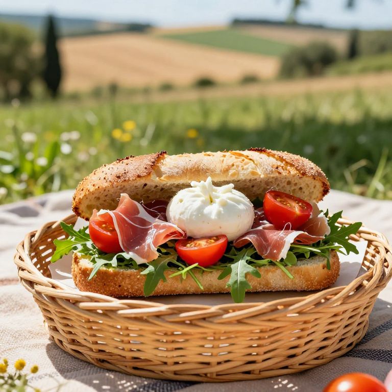 Panuozzo sandwich with fresh arugula, prosciutto, cherry tomatoes, and creamy burrata cheese, rustic wicker basket presentation, summer outdoor picnic with sunlit fields in background, Mediterranean food aesthetic, high resolution and vivid colors
