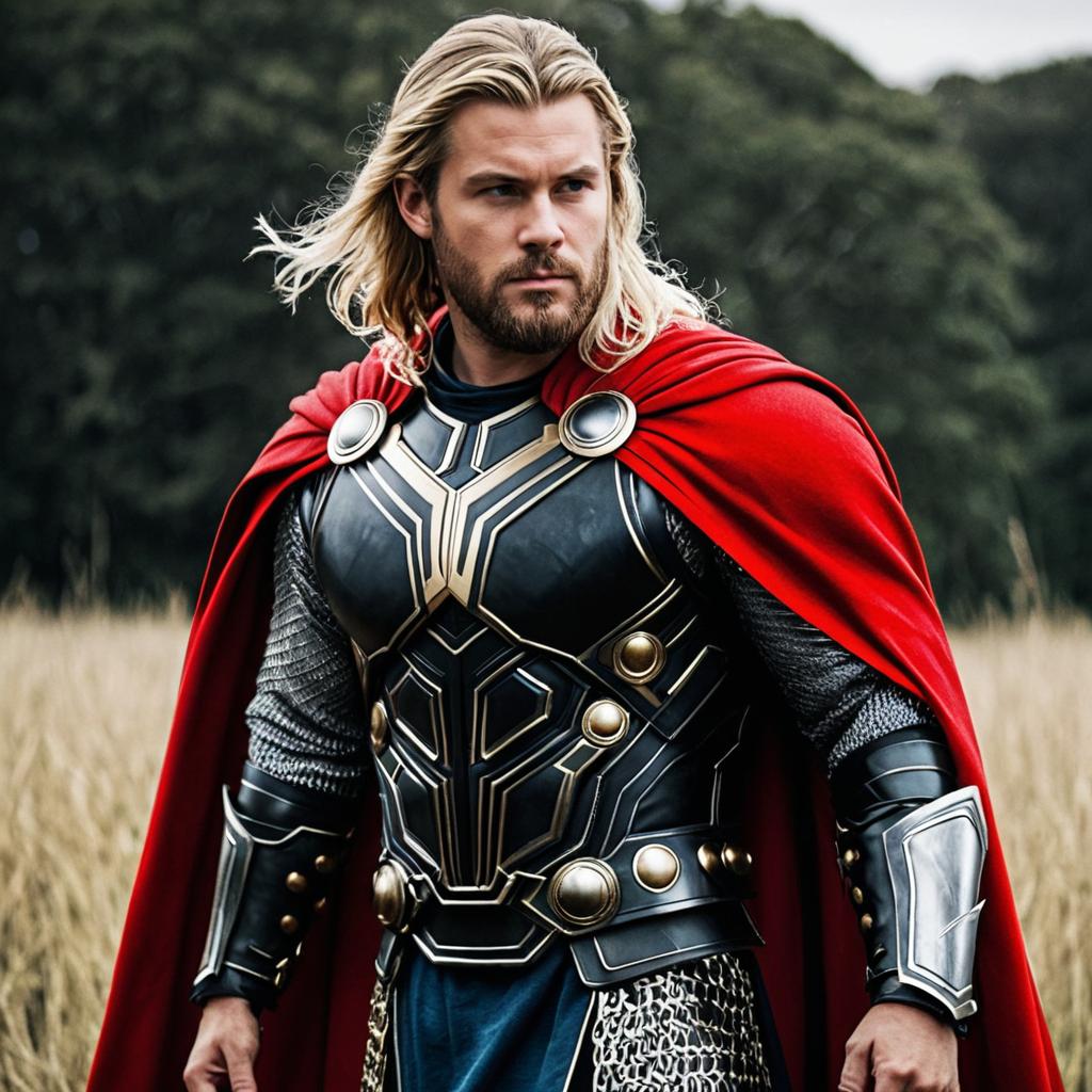 A muscular man dressed as Thor in a detailed armored costume with a red cape and horned helmet. The man has long blonde hair and a serious expression, standing outdoors in a green park setting.