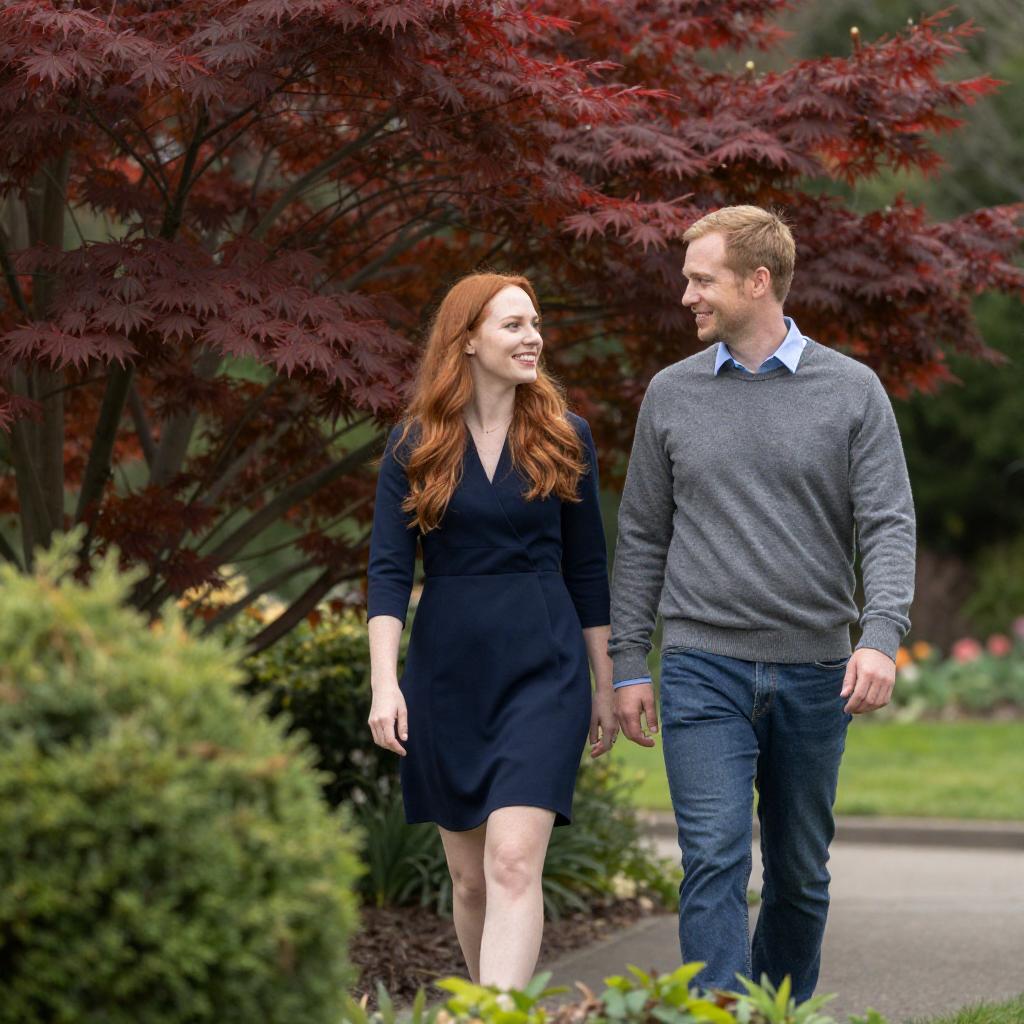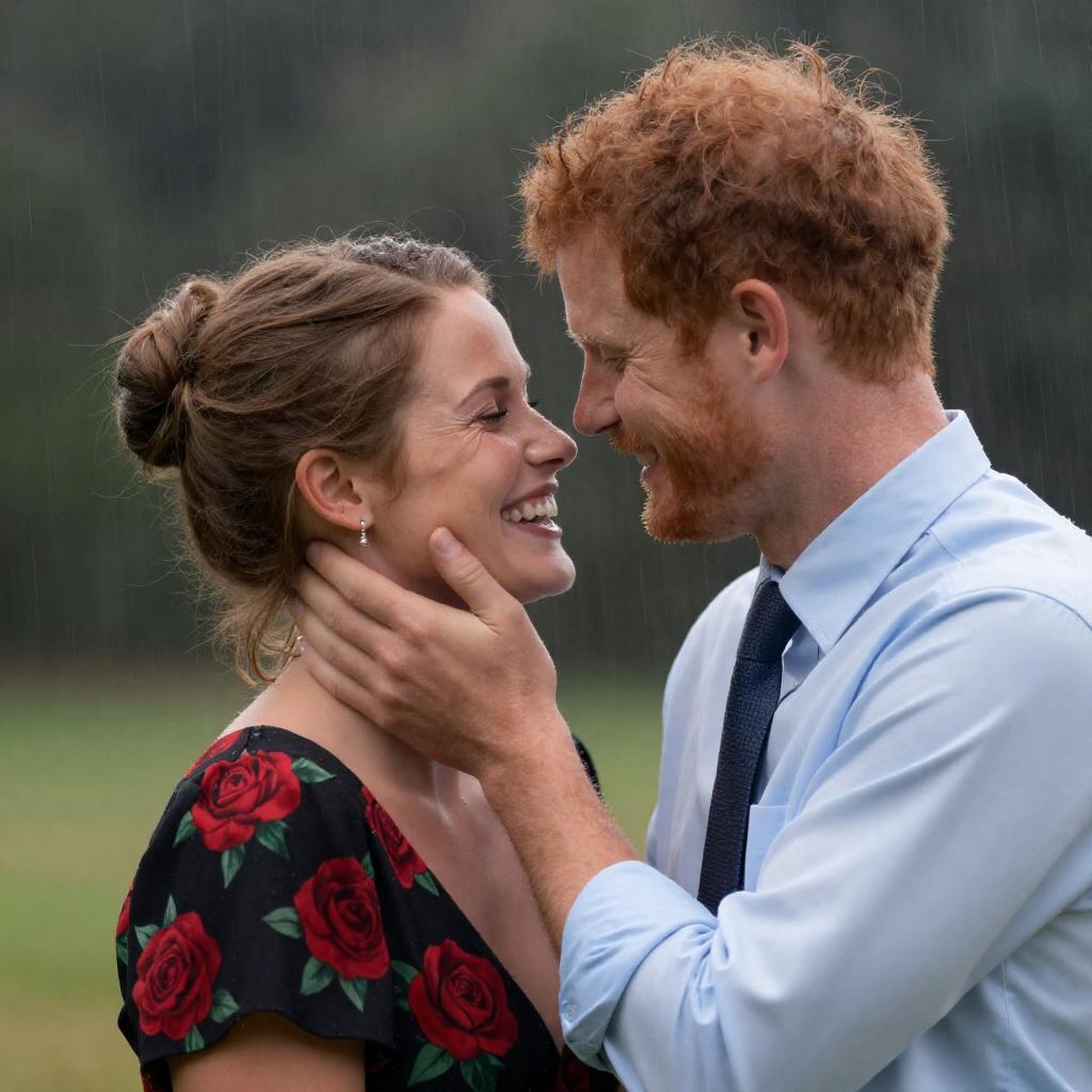 Photograph of a couple in a rainstorm. Woman in red dress, laughing, hand on man's chin. Man in blue suit, smiling. Green blurred background. Rain streaks visible. Woman's hair wet, red. Man's hair red, short. Close-up.