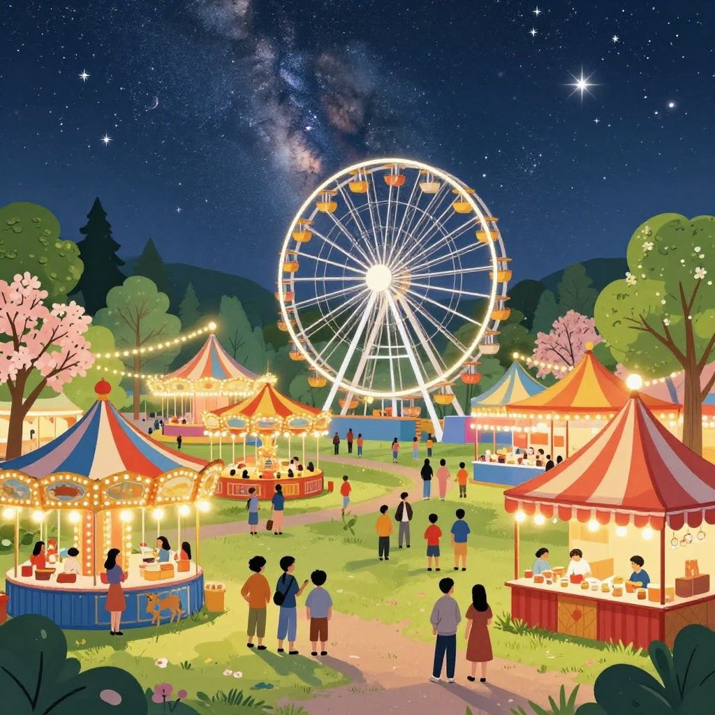 Illustration of a lively spring fair at night featuring a large Ferris wheel, colorful striped tents and carousels, game booths, and food stands. The fairground is surrounded by lush green trees and blooming flowers, under a starry sky with a visible Milky Way. Visitors of various ages enjoy the festive atmosphere and bright lights illuminating the scene.