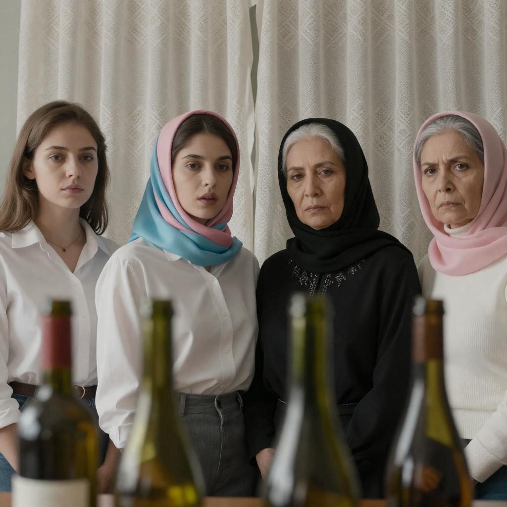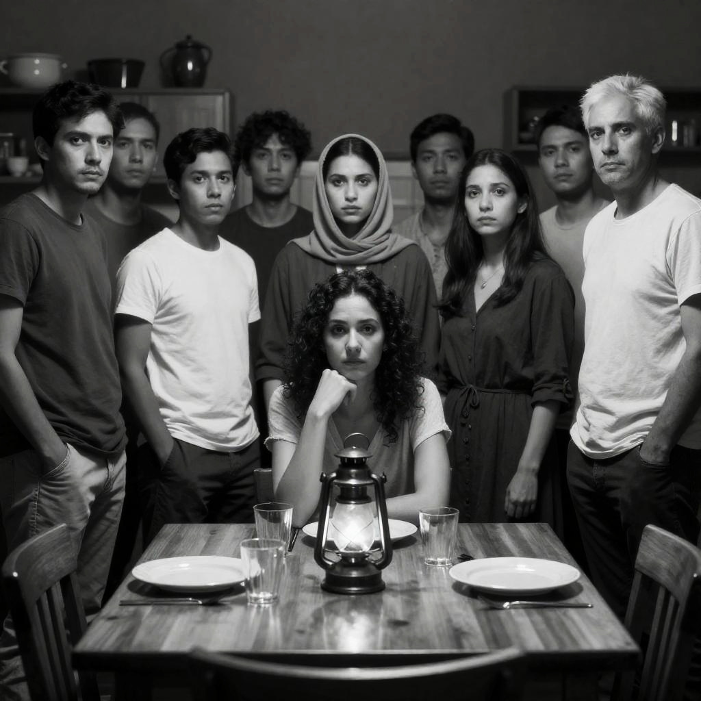 Black-and-white photograph of 8 people around a wooden table in a dimly lit room. Central woman with dark curly hair, light-colored top, rests chin on hand, looking to the left. Seven others stand around the table, some with hands in pockets. Table has plates, glasses, and a lantern. Woman in dark dress with headscarf stands in the background. One man with white hair stands to the right. Intense expressions visible on faces. Background includes kitchen utensils and cabinets.