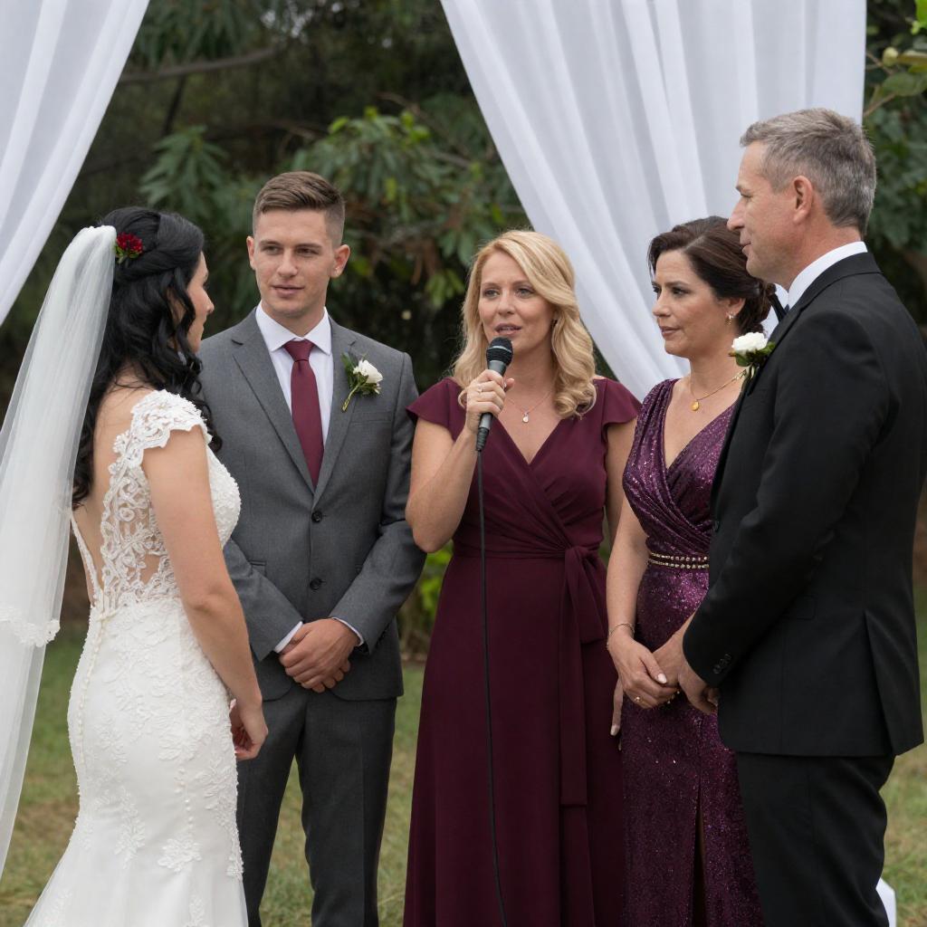 Photograph of wedding ceremony. Five people: groom in gray suit with red tie, bride in white lace dress, blonde woman in burgundy dress speaking at microphone, woman in purple sequin dress, older man in black suit. Green foliage and white drapes in background. Groom and bride standing left, others right. Bride with long black hair, red flower in hair. Groom with short brown hair, bride with shoulder-length blonde hair, purple woman with updo, older man with short gray hair. Microphone in center.