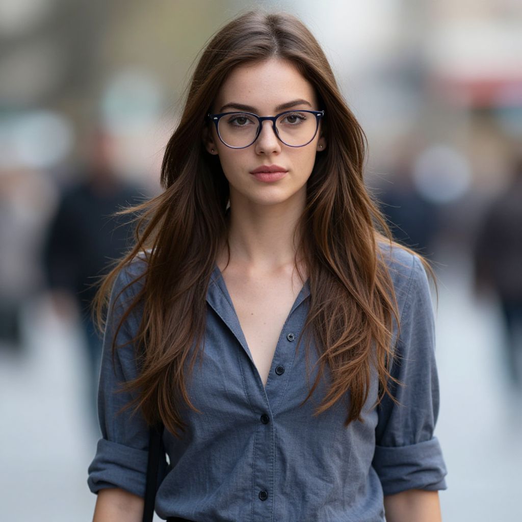 "alex vause outfit, 1girl, solo, glasses, brown hair, long hair, blurry background, realistic, blurry, looking at viewer, shirt, sleeves rolled up, lips, jacket, freckles, outdoors Realistic photo of casual sexy person with pretty face"