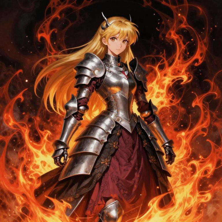 Digital anime-style artwork of a blonde woman with long hair, wearing silver armor with black accents and a red, flowing skirt. She stands confidently amidst swirling orange and yellow flames, which illuminate her determined expression. Her armor includes shoulder guards, gauntlets, and a chest plate, with intricate designs visible on the skirt. The background is dark, highlighting the fiery effect. Her eyes are a striking yellow, adding to her intense, warrior-like appearance. The flames create a dynamic contrast with the sleek, metallic shine of her armor.