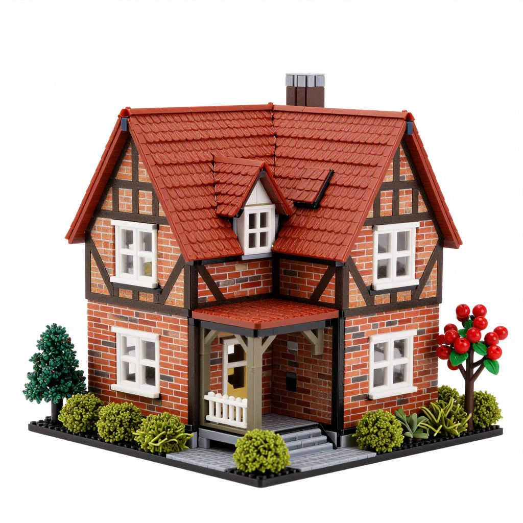 Tudor-style house model kit featuring intricate brickwork, timber-framed walls, steep red-tiled roofs, and a charming front porch surrounded by neatly trimmed green shrubs and vibrant red berries.