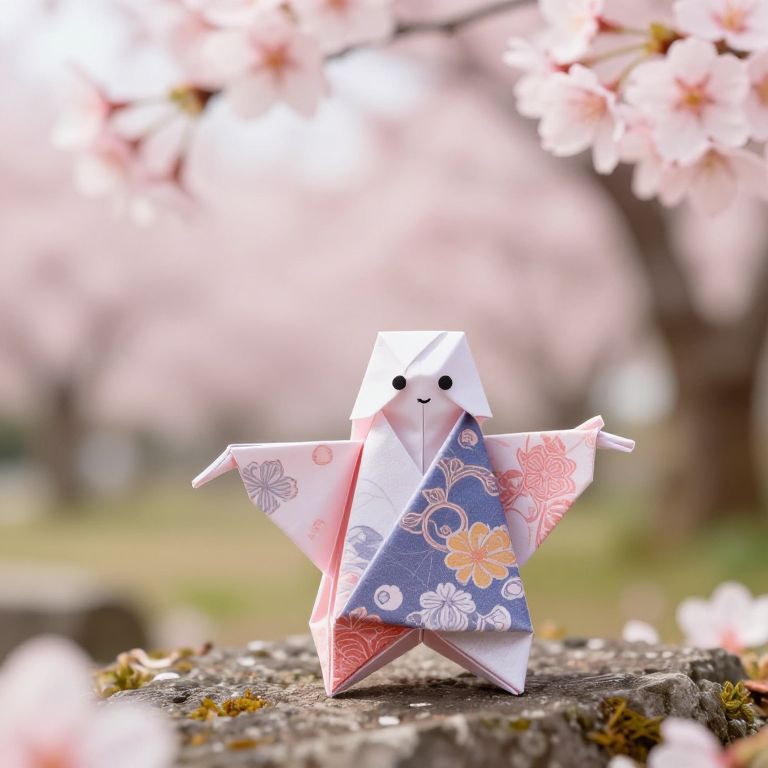 Kuki, a traditional Japanese origami figure transformed into a lively character, set against a backdrop of cherry blossoms in full bloom, with intricate folds and patterns, embodying the essence of spring and cultural artistry in a serene garden.
