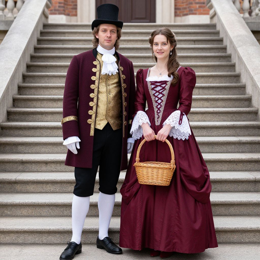 Two individuals dressed in vibrant 18th-century-inspired costumes stand side by side on a stone staircase, featuring a man in a maroon coat with gold trim, black breeches, and a top hat, alongside a woman in a rich burgundy gown with lace-up bodice, white cuffs, and a wicker basket held in her hands.