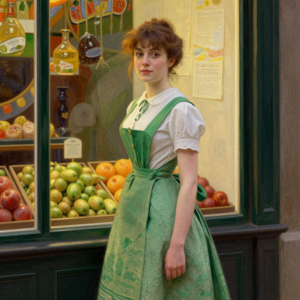 A woman in a vintage-style green pinafore dress stands before a brightly lit fruit shop window, reminiscent of James Tissot's \"The Shop Girl\" from his \"Women of Paris\" series (1883-85), rendered here in a high-definition digital art style that captures the nostalgic charm and detailed realism of the original oil painting.