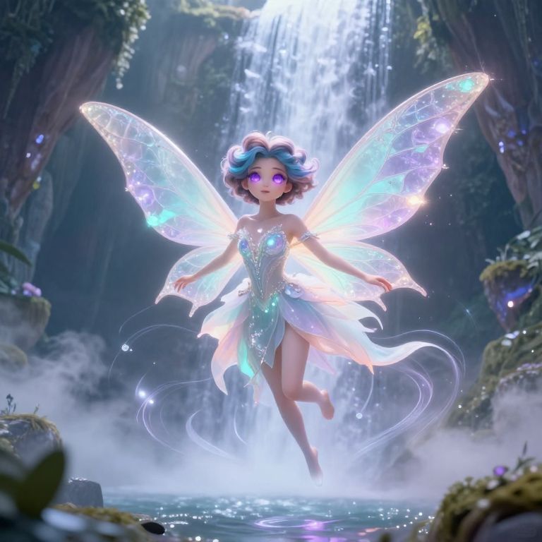 A glowing fairy queen with large, luminous violet eyes and soft blue-brown curls floats above a crystal-covered waterfall, her glitter wings unfolding like ribbons in pastel hues of mint, lavender, and peach. The scene is set in a fantasy valley with floating islands and misty clouds, where magic pulses gently around her in visible light waves.