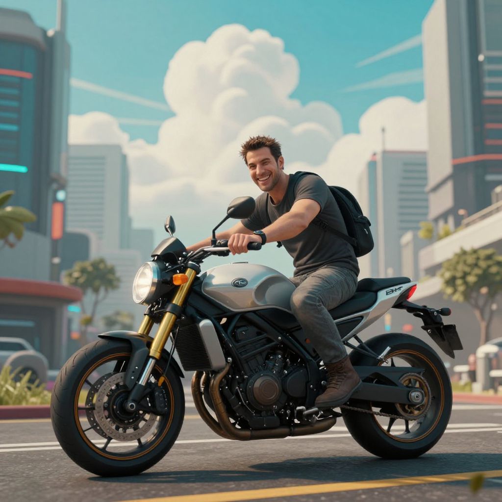Photorealistic CGI: Smiling, muscular man with short brown hair, wearing black t-shirt, jeans, and backpack, rides white motorcycle through busy