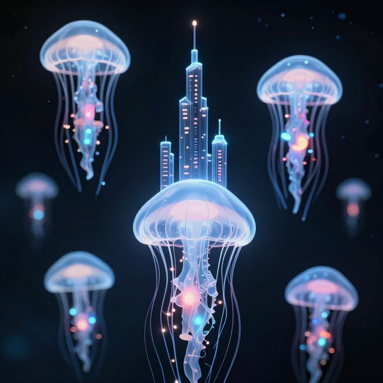 Transparent, jellyfish-like cities drift noiselessly through outer space, their inhabitants communicating through glowing emotional frequency pulses.