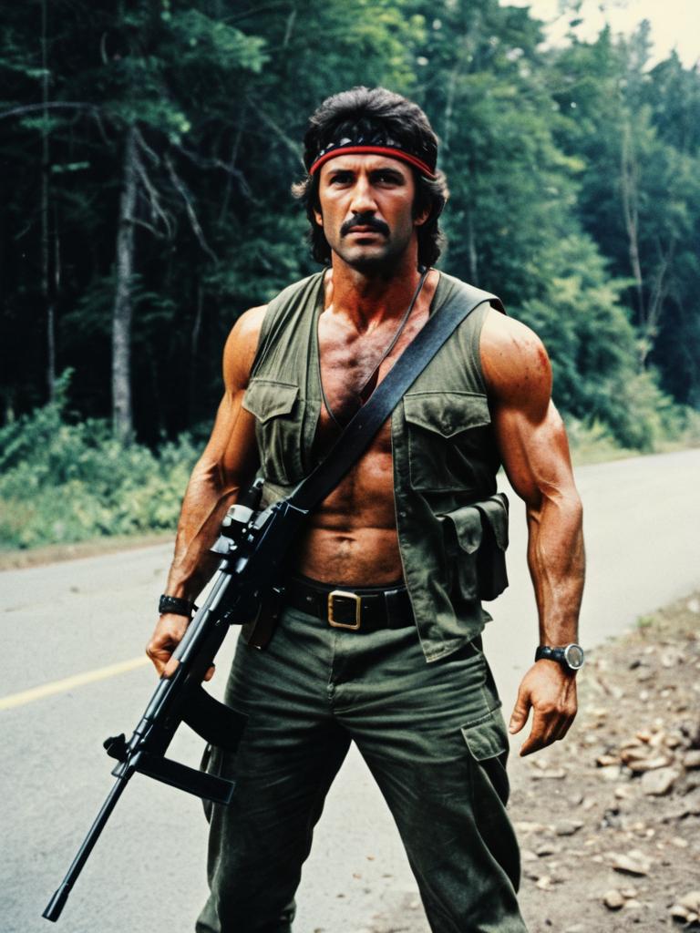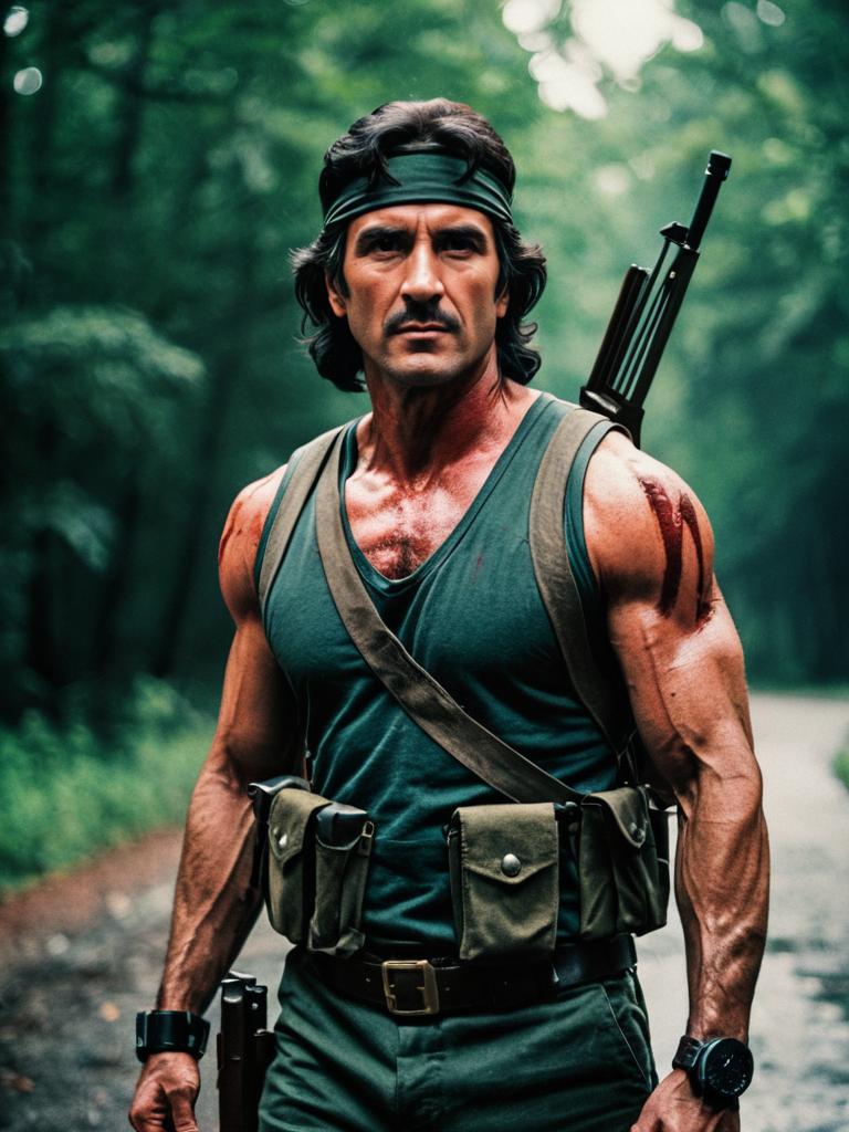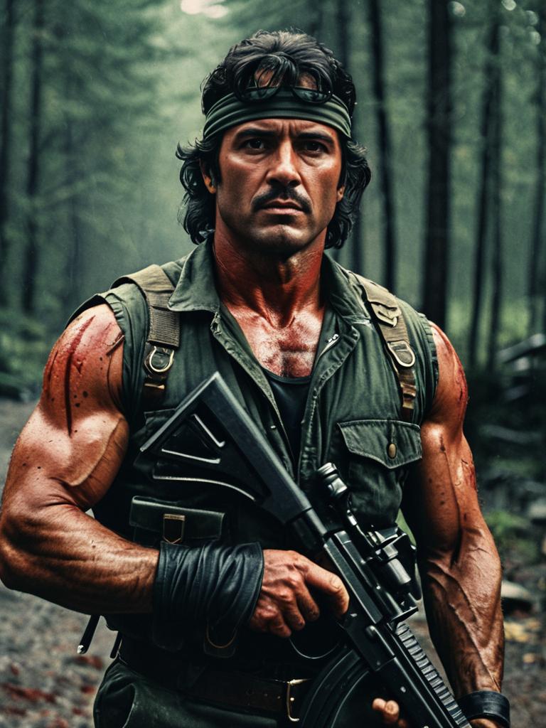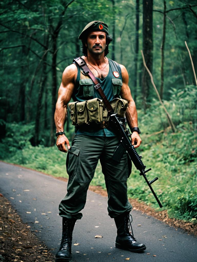 Man in Rambo First Blood costume, photorealistic outdoor action photo