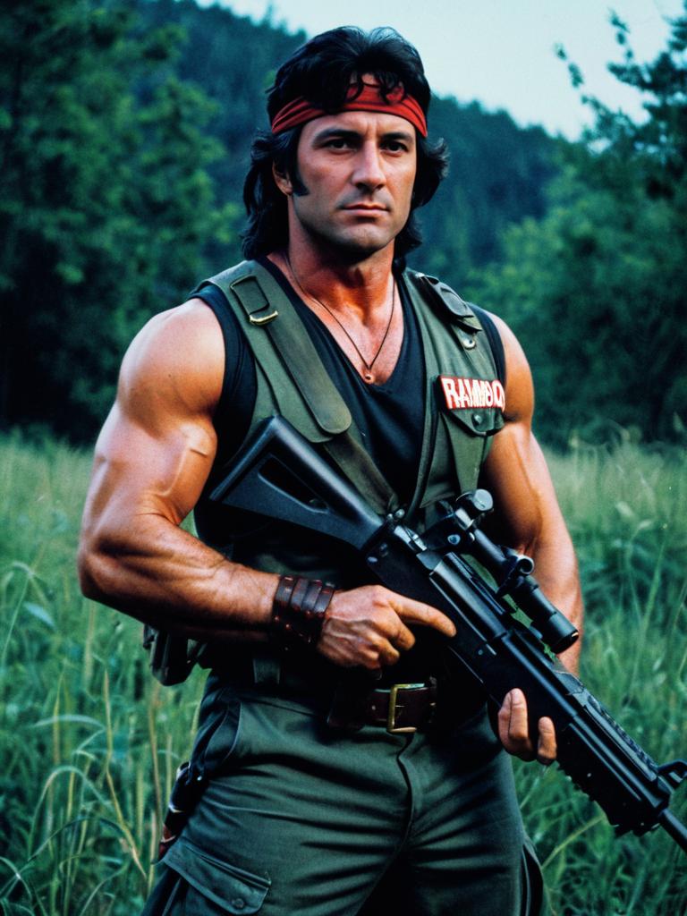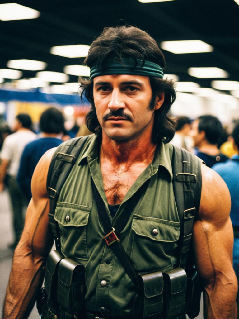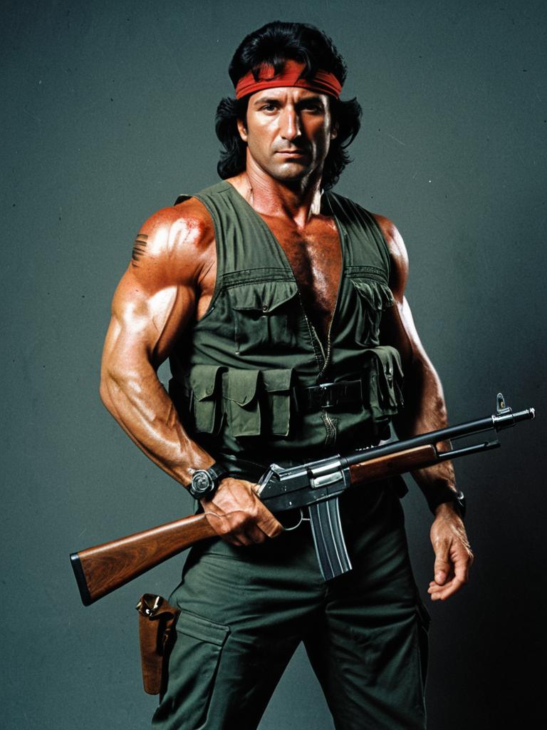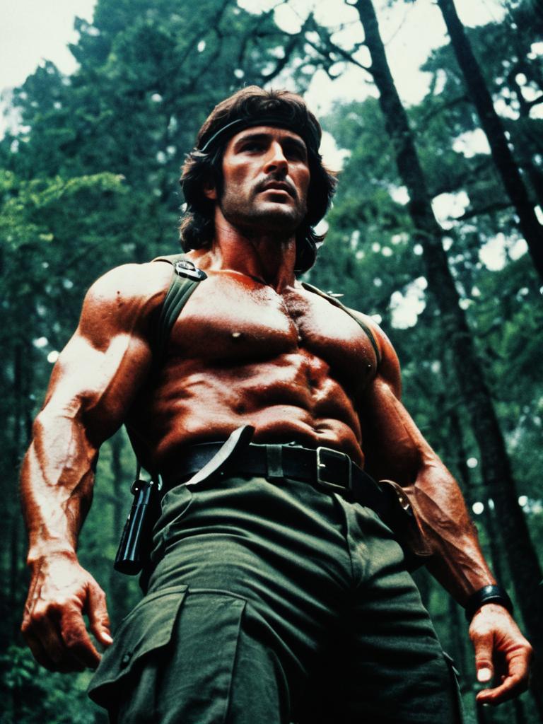 Man in Rambo First Blood costume, photorealistic outdoor action photo
