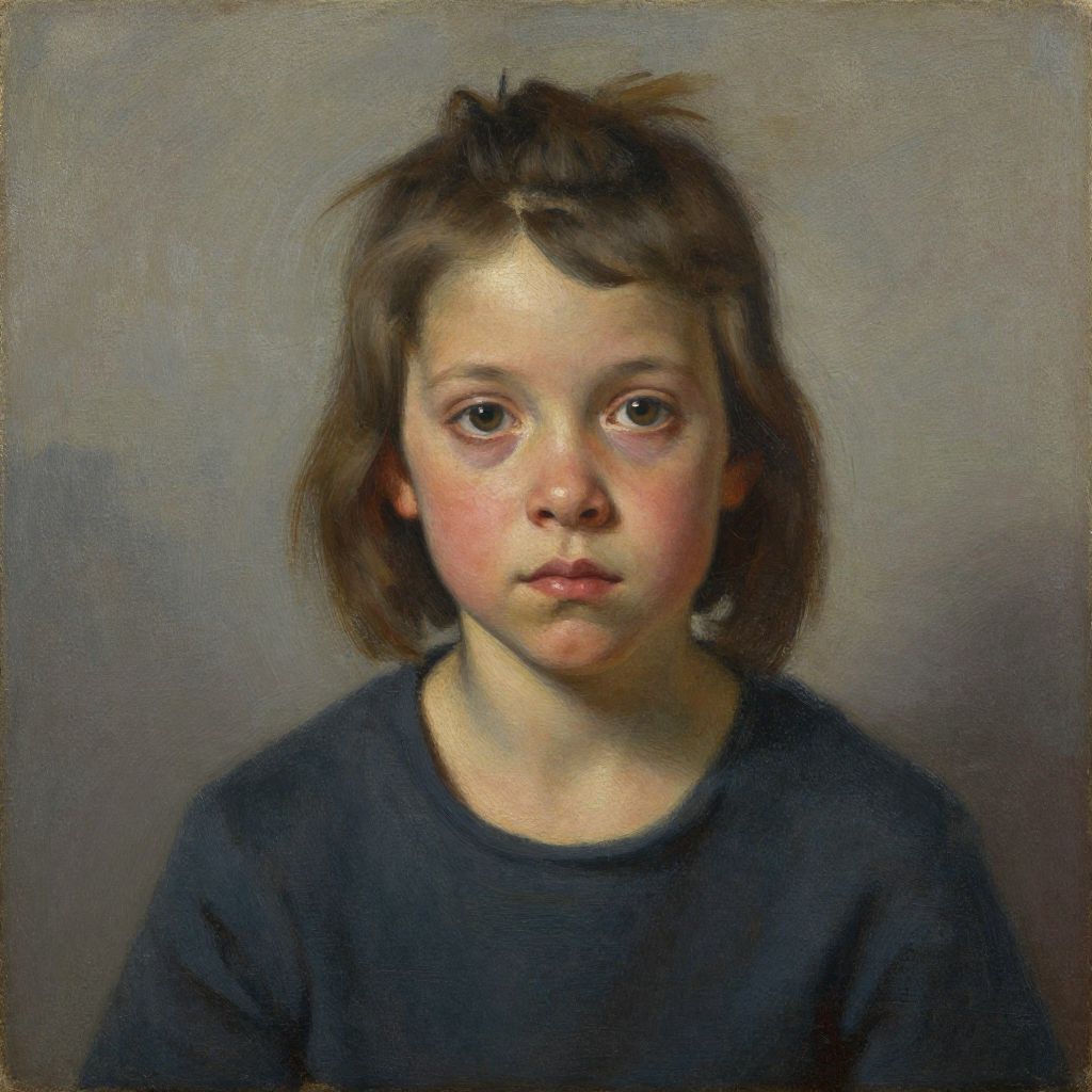Realistic oil painting of a young girl with fair skin, brown wavy hair, wide brown eyes, and a serious expression, wearing a dark blue