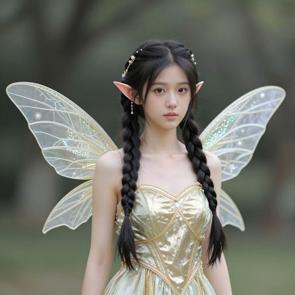 Photograph of an East Asian woman with long, straight black hair, wearing a light blue, sleeveless dress with lace trim. She has translucent, white fairy wings with delicate vein patterns. She is kneeling on green grass, looking directly at the camera with a slight smile. The background is a blurred grassy field, emphasizing the subject. Her skin is fair, and she has a petite build. The overall style is whimsical and fantasy-like, with a soft, natural light highlighting her features.