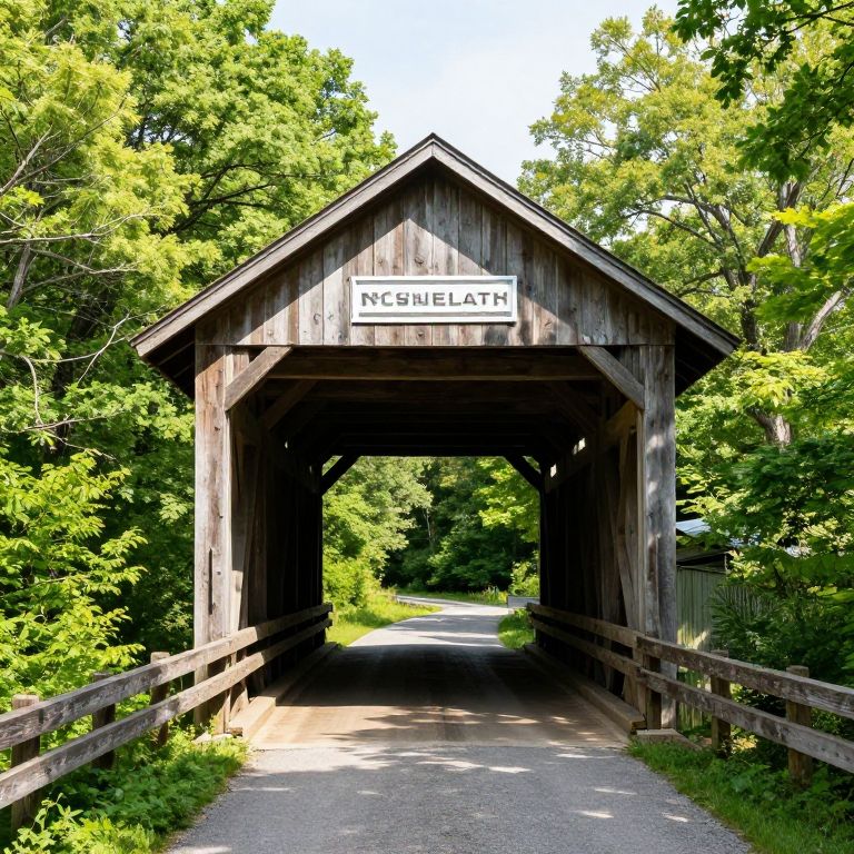 Ashuelot Covered Bridge stands majestically amidst lush greenery, its wooden structure framed by vibrant trees and flanked by rustic railings, leading to a serene, sunlit path beyond.