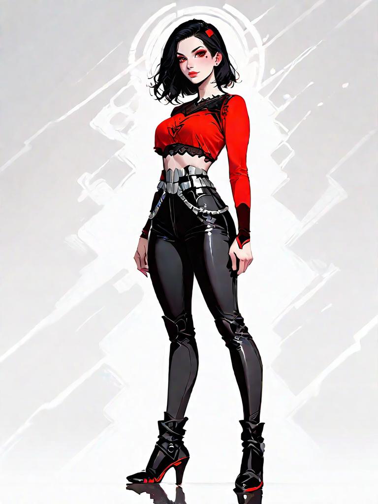 Digital artwork of a confident woman with a realistic face and short black hair, wearing a red lace long-sleeve crop top with a solid underlay and scoop neckline. She is dressed in fitted high-waist black pants paired with a metallic belt featuring intricate detailing. She completes her look with black heeled boots and red eye makeup, standing in a full body pose against a white abstract background.