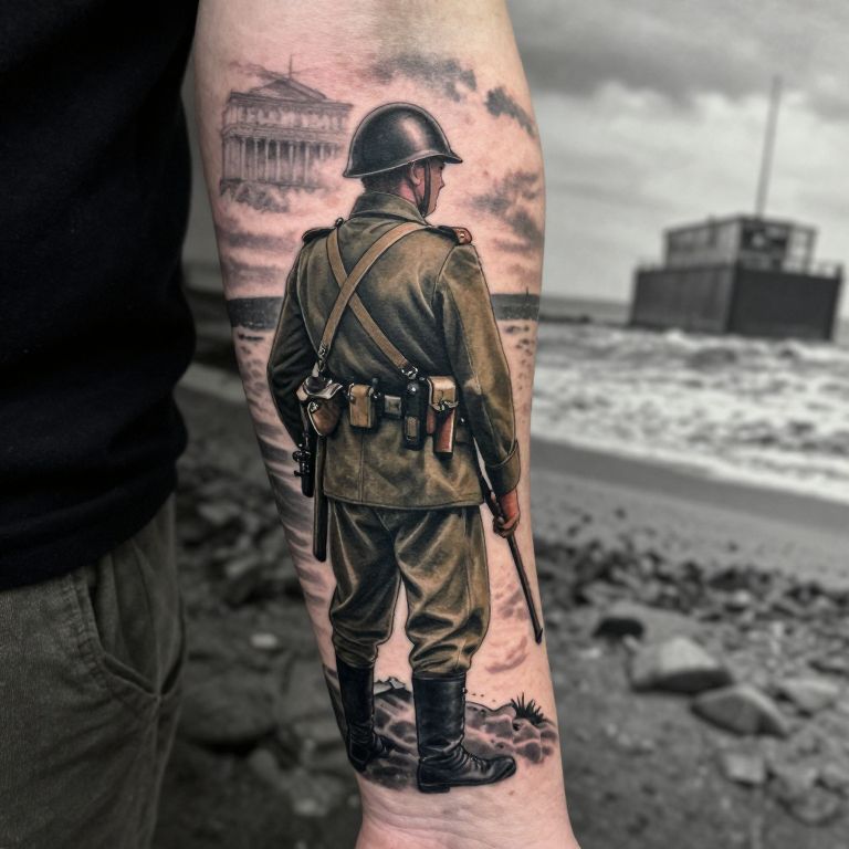Perspective Scottish soldier from world war ii on beach of dunkirk. Greyscale style tattoo with color,