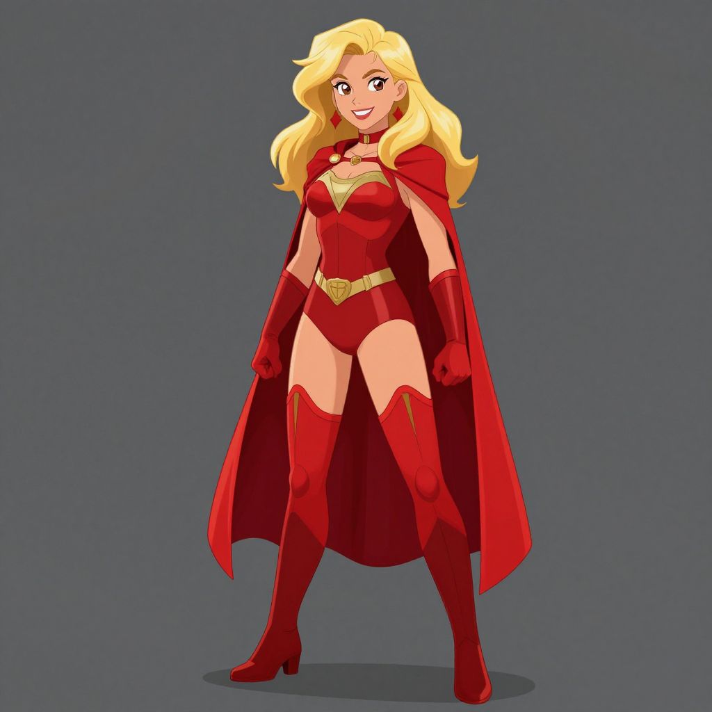 Female superhero costume, 1girl, solo, cape, superhero, bodysuit, long hair, blonde hair, animification, red cape, gloves, boots, full body, standing, brown hair, smile, belt