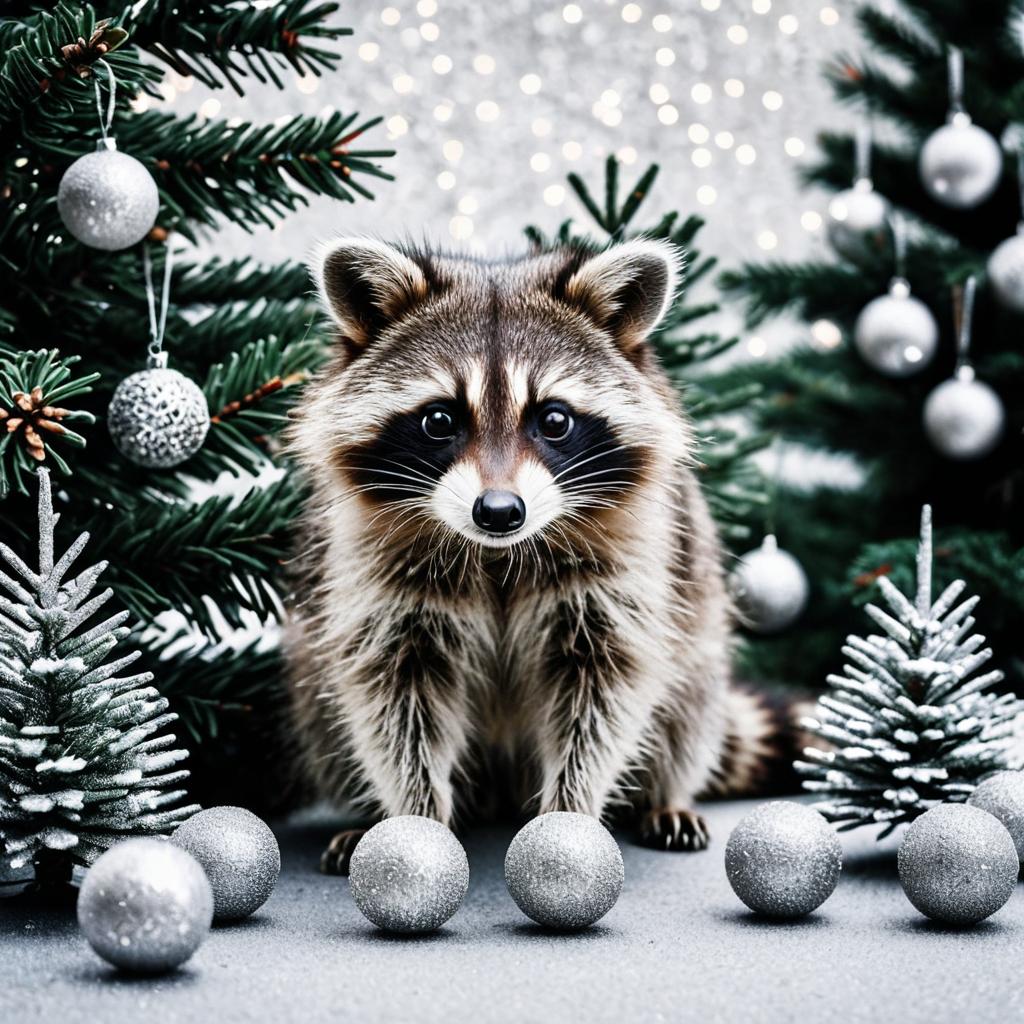 A small raccoon sitting among silver Christmas tree balls and decorated spruce trees. The scene features frosted miniature pine trees and sparkling silver baubles, set against a softly lit background with bokeh lights, evoking a festive and nostalgic holiday atmosphere.