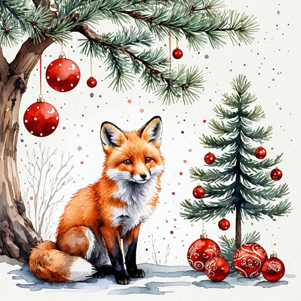 A New Year's card in the style of a nostalgic 90s greeting card art, a small playful angry raccoon on the background of a beautiful, large spruce tree that grows on the edge, decorated with beautiful silver Christmas tree balls