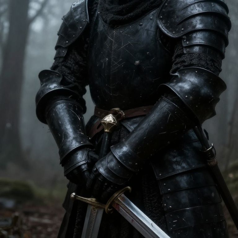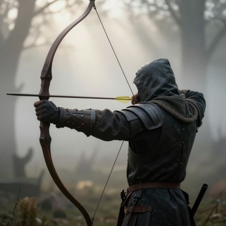 Photograph of a hooded archer in dark, medieval-style armor drawing a bow in a misty, sunlit forest, with blurred trees and